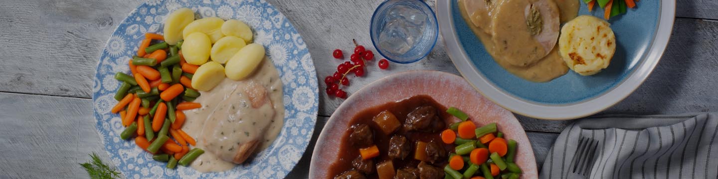Try traditional favourites like our classic Sausages in Rich Onion Gravy, served with Cheddar cheese mashed potato, red cabbage and our apple and port carrots. Or how about something more Mediterranean, like our Chicken & Chianti Casserole, made with Italian Chianti wine and served with potato gratin, carrots, peas, and green beans?